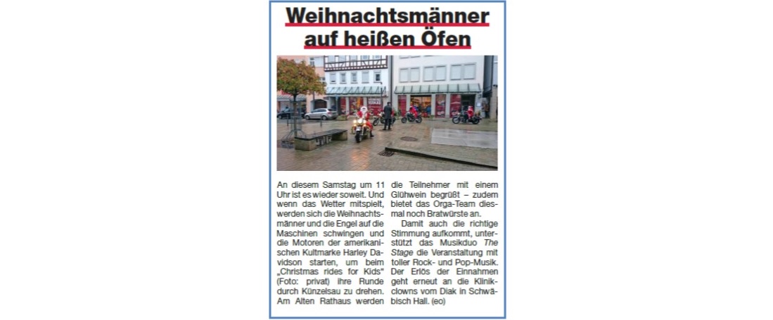 Der erste Christmas ride for Kids fand am 24.12.2016 in Künzelsau statt, eigentlich war das nur so ein Gag von Joachim Schmidt.
