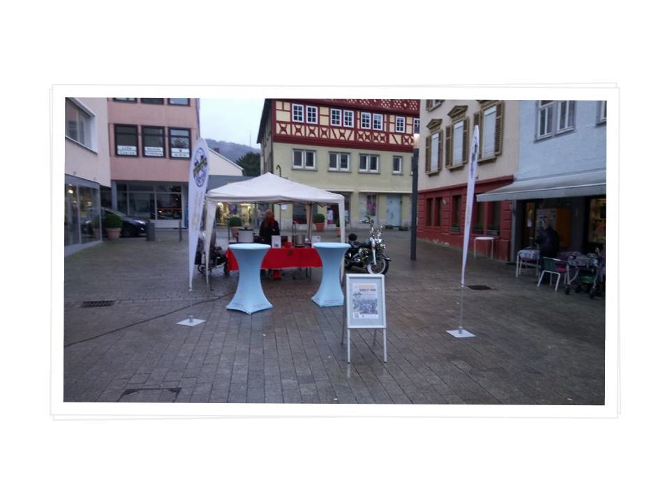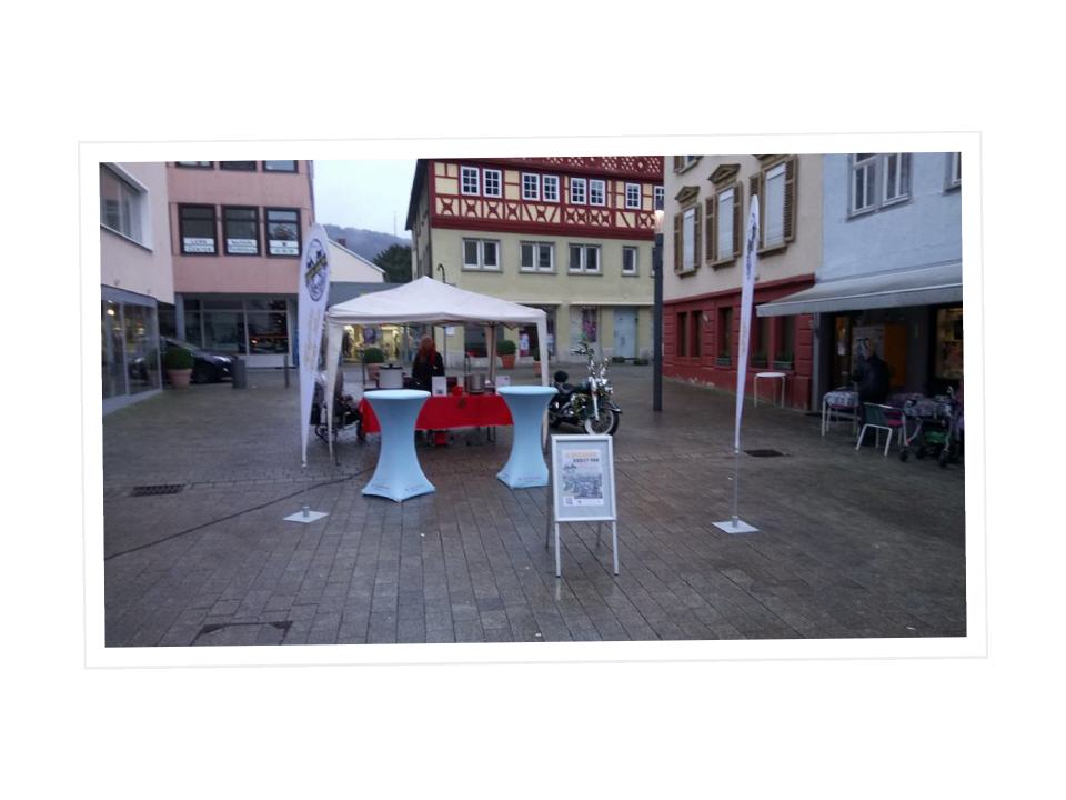 Trotz des schlechten Wetters haben sich ein paar Biker beim Treffpunkt eingefunden. Die Jungs und das Mädel drehten ein paar Runden durch die Stadt und versammelten sich dann an unseren Glühweinstand am Alten Rathaus. Dort haben wir für einen guten Zweck Glühwein verkauft und Geld gesammelt. Ingesamt ist ein Betrag von 500 Euro zusammen gekommen, das Geld wird dem DIAK in Schwäbisch Hall übergeben und mit diesen Betrag werden zwei Termine für die Klinikclowns bezahlt.