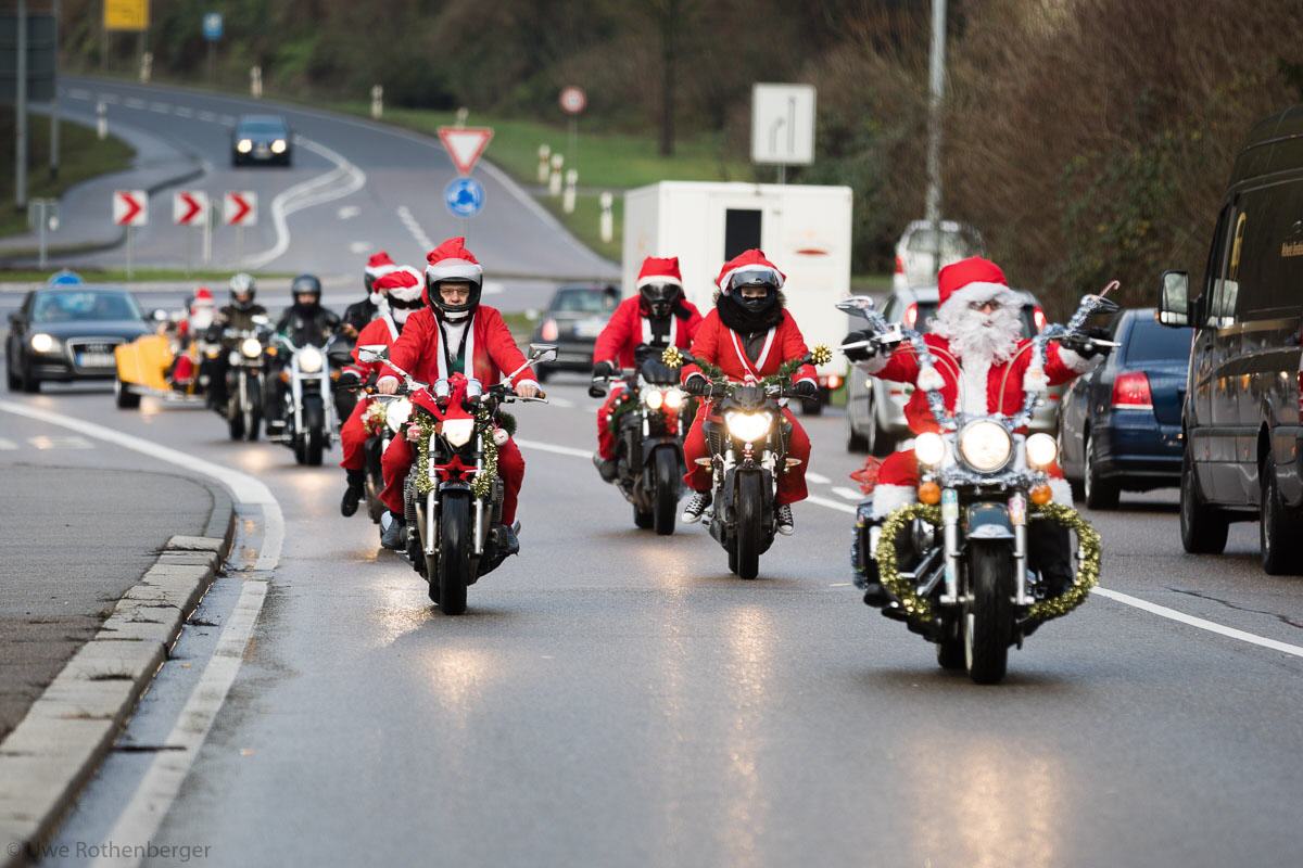 Bereits zum zweiten Mal fand in Künzelsau der "Christmas rides for kids" statt. Am 16.12.2017 trafen sich gegen elf Uhr Uhr knapp ein Dutzend, als Nikolaus und Engel verkleidete, Motorradfahrer am Mc Donalds in Künzelsau und drehten mit ihren weihnachtlich geschmückten Bikes ein paar Runden durch die Stadt. Warum? Alles für einen guten Zweck! Denn die Fahrt endete am alten Rathaus in Künzelsau wo fleißig Bratwürste, Glühwein "Heißer Hirsch", Punsch, Waffeln und Cup Cakes bis zum Nachmittag verkauft wurden. Die kompletten Einnahmen und Spenden werden ans Diakonie Krankenhaus nach Schwäbisch Hall gespendet, nämlich für die "Klinik Clowns". Die Clowns sorgen dafür, dass Kinder, die einige Tage und Wochen stationär aufgenommen werden eine tolle und lustige Abwechslung erleben können. So klappt es dann auch viel besser mit dem gesund werden. Finden Sie diese Aktion auch toll? Dann unterstützen Sie den "Christmas rides for kids" auch im nächsten Jahr, der Termin steht schon fest. Am 15.12.2018 werden erneut Weihnachtsmänner und Engel auf ihren heißen Öfen durch Künzelsau knattern um auch im darauf folgenden Jahr wieder Kinderherzen in Krankenhäusern, beim Anblick der lustigen "Klinik Clowns", höher schlagen zu lassen.
