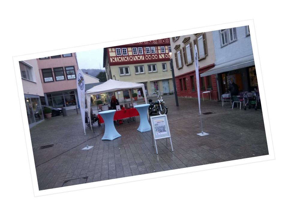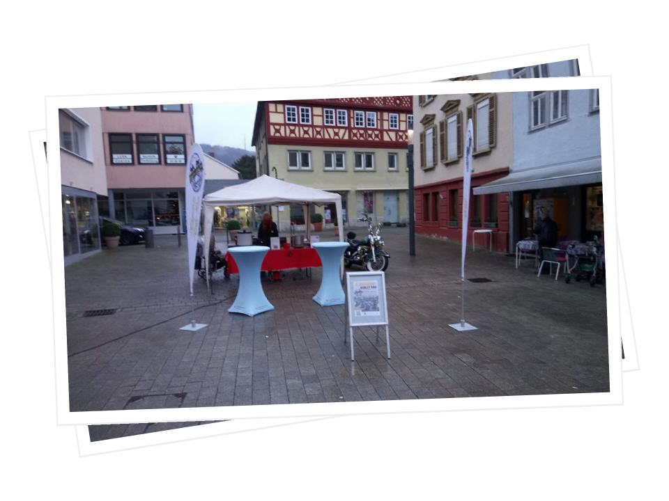Trotz des schlechten Wetters haben sich ein paar Biker beim Treffpunkt eingefunden. Die Jungs und das Mädel drehten ein paar Runden durch die Stadt und versammelten sich dann an unseren Glühweinstand am Alten Rathaus. Dort haben wir für einen guten Zweck Glühwein verkauft und Geld gesammelt. Ingesamt ist ein Betrag von 500 Euro zusammen gekommen, das Geld wird dem DIAK in Schwäbisch Hall übergeben und mit diesen Betrag werden zwei Termine für die Klinikclowns bezahlt.